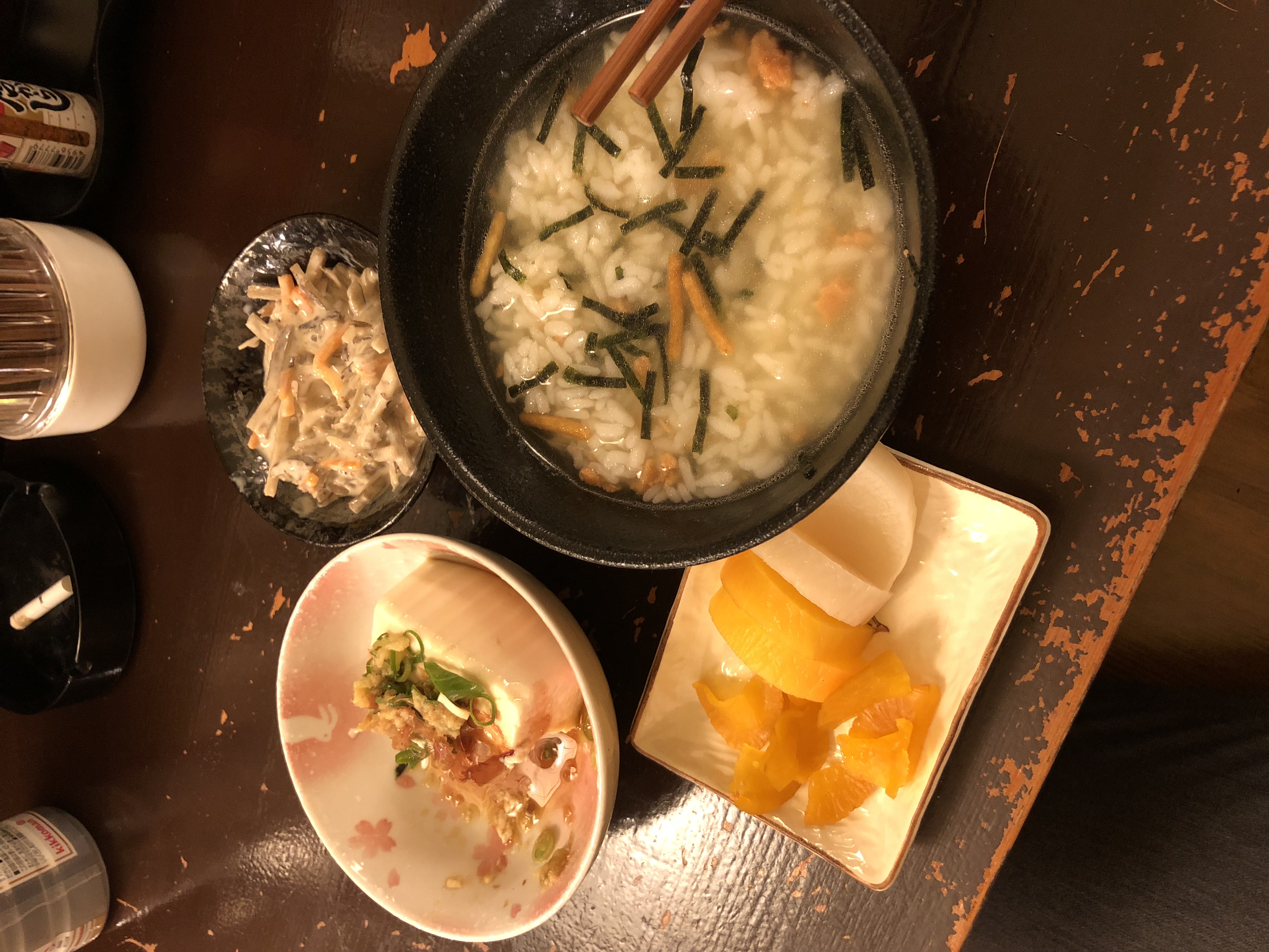 今日のメニューは織田豆腐とお茶漬けです。突き出しのごぼうサラダとお茶漬けの付け合わせで漬物があったので満腹になりました。